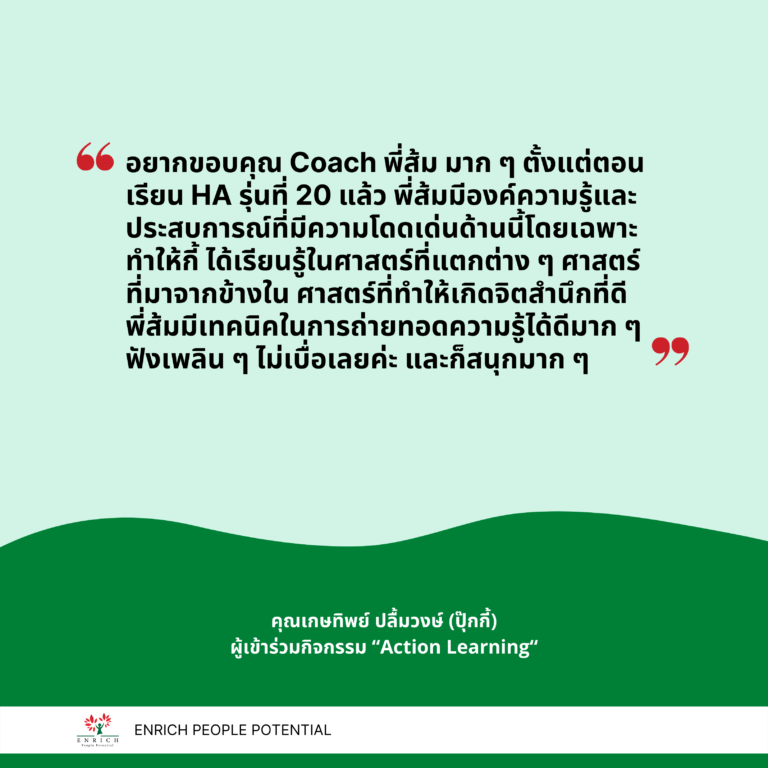 อยากขอบคุณ Coach พี่ส้ม มาก ๆ ตั้งแต่ตอนเรียน HA รุ่นที่ 20 แล้ว พี่ส้มมีองค์ความรู้และประสบการณ์ที่มีความโดดเด่นด้านนี้โดยเฉพาะ ทำให้กี้ ได้เรียนรู้ในศาสตร์ที่แตกต่าง ๆ ศาสตร์ที่มาจากข้างใน ศาสตร์ที่ทำให้เกิดจิตสำนึกที่ดี พี่ส้มมีเทคนิคในการถ่ายทอดความรู้ได้ดีมาก ๆ ฟังเพลิน ๆ ไม่เบื่อเลยค่ะ และก็สนุกมาก ๆ จนกระทั่งได้มาเข้าร่วมกิจกรรม Action Learning ซึ่งเป็นกิจกรรมที่ยาก แต่ก็ได้อะไรจากกิจกรรมมาก ๆ เช่นกัน โดยเฉพาะการสะท้อนกลับในทุก ๆ สิ่งที่เราทำ กี้ถือว่าเป็นบุคคลที่โชคดีมาก ๆ คนหนึ่งที่ได้มาเป็นลูกศิษย์ Coach พี่ส้ม และก็ขอบคุณพี่ส้มที่ได้มอบพลังแห่งจักรวาลให้พวกเราใน Class สุดท้าย เป็นความรู้สึกที่มาก ๆ ค่ะ รู้สึกผ่อนคลาย ๆ เย็น ๆ ร้อนวูบวาบจากข้างในตัวเรา ตรงจุด Focus ที่หัวใจ ทำให้เรามีหัวใจที่เข้มแข็ง และสามารถที่จะพัฒนาความคิด พัฒนาตัวเองจากข้างใน ให้ดียิ่งขึ้นต่อไป